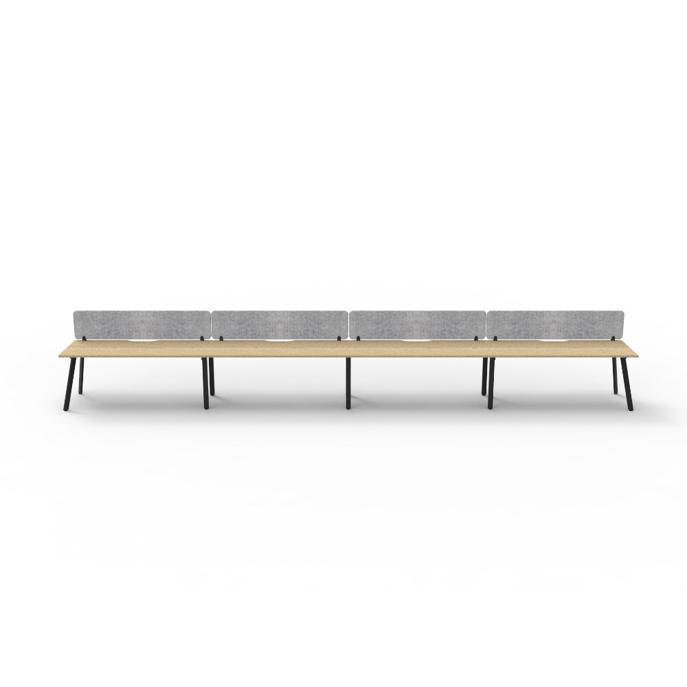 4 person single sided workstation with Natural Oak top and Black Satin frame, Grey Eco screen.