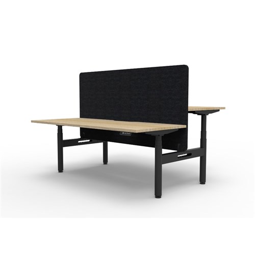 Electric height adjustable 2 person back to back workstation with Natural Oak top and Black Satin frame, Black Eco screen.