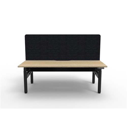 Electric height adjustable 2 person back to back workstation with Natural Oak top and Black Satin frame, Black Eco screen.