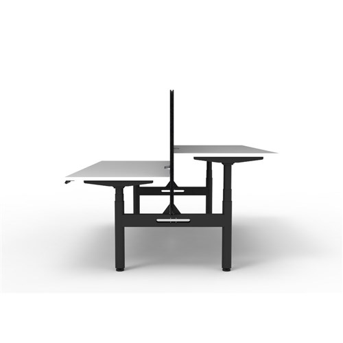 Electric height adjustable 2 person back to back workstation with White top and Black Satin frame, Black Eco screen.