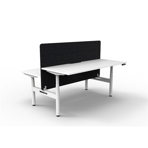 Electric height adjustable 2 person back to back workstation with White top and White Satin frame, Black Eco screen.