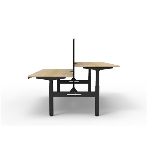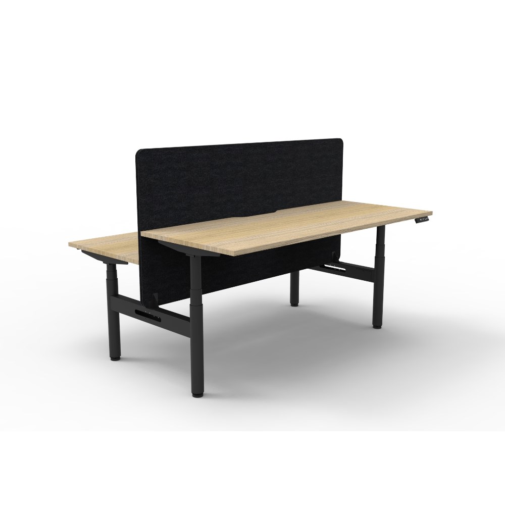 Electric height adjustable 2 person back to back workstation with Natural Oak top and Black Satin frame, Black Eco screen.