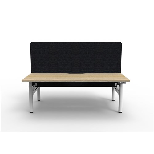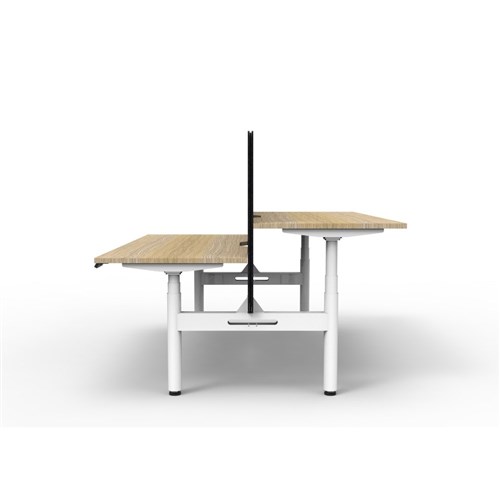 Electric height adjustable 2 person back to back workstation with Natural Oak top and White Satin frame, Black Eco screen.