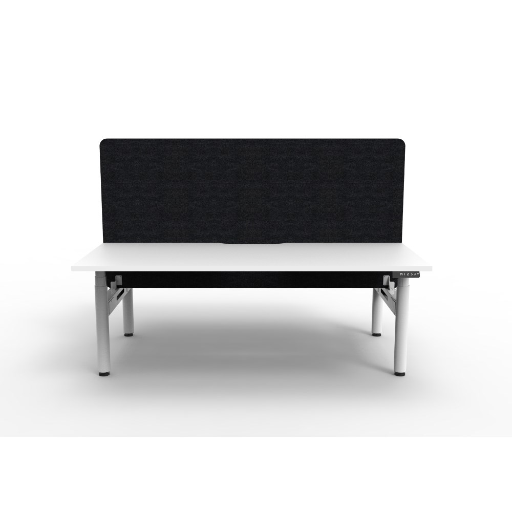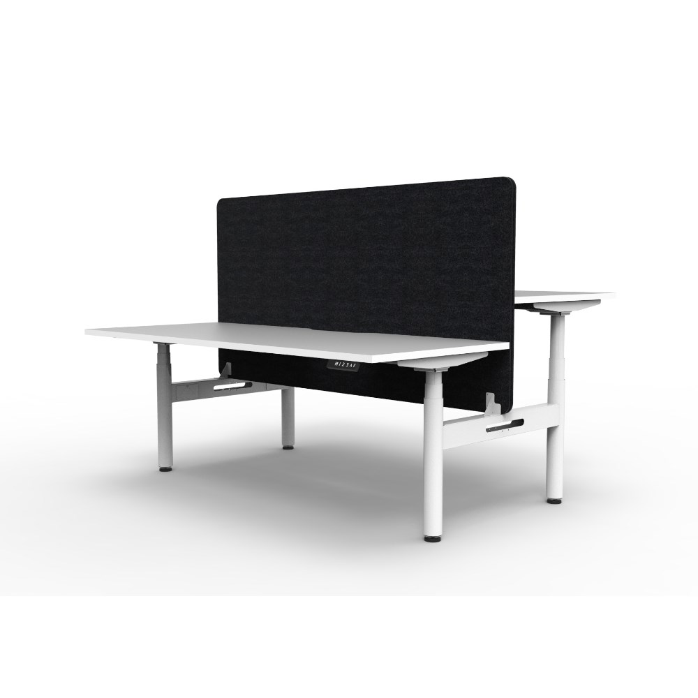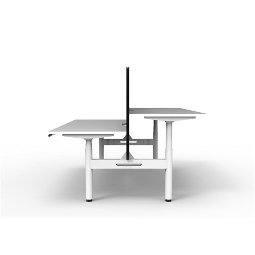 Electric height adjustable 2 person back to back workstation with White top and White Satin frame, Black Eco screen.
