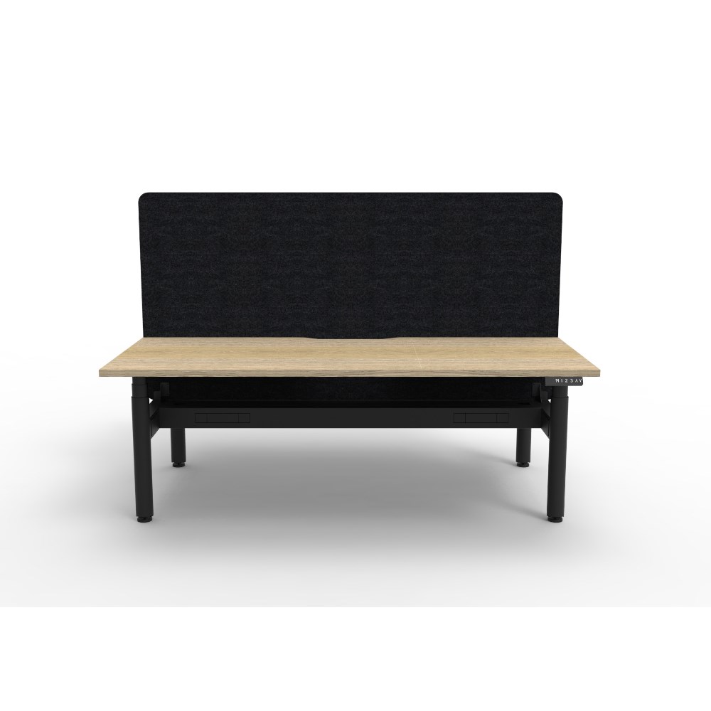 Electric height adjustable 2 person back to back workstation with Natural Oak top and Black Satin frame, Black Eco screen and cable tray.