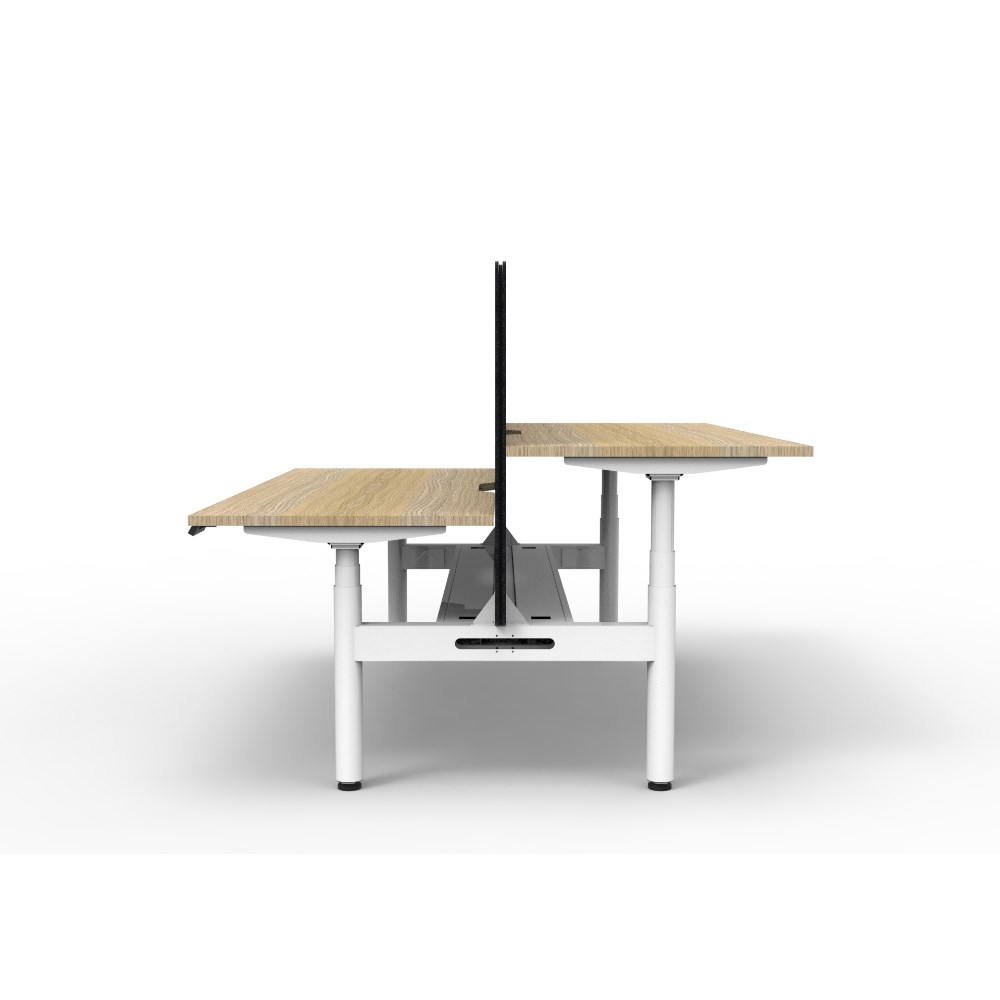 Electric height adjustable 2 person back to back workstation with Natural Oak top and White Satin frame, Black Eco screen and cable tray.