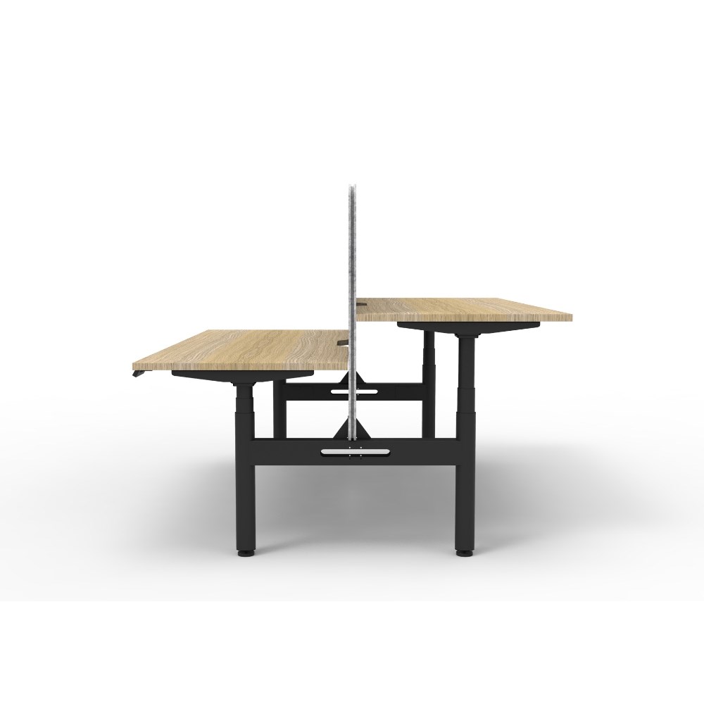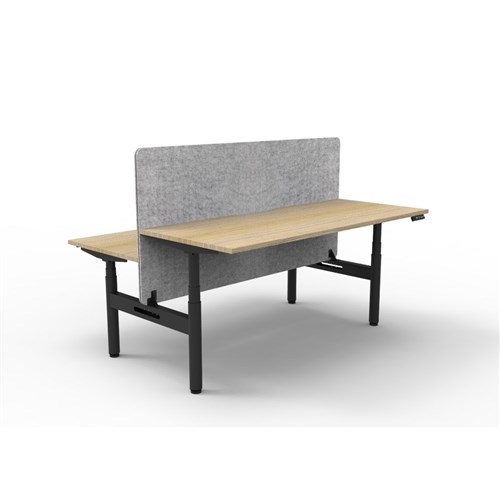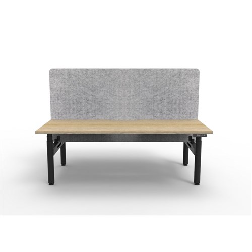 Electric height adjustable 2 person back to back workstation with Natural Oak top and Black Satin frame, Grey Eco screen.