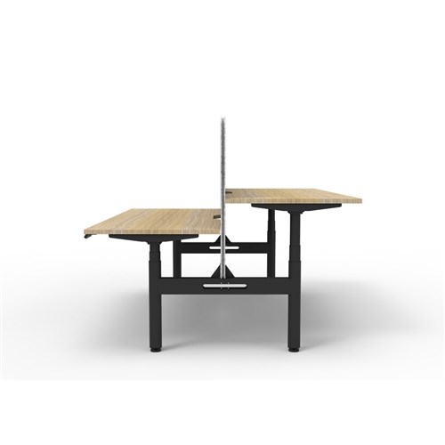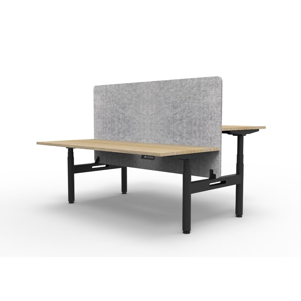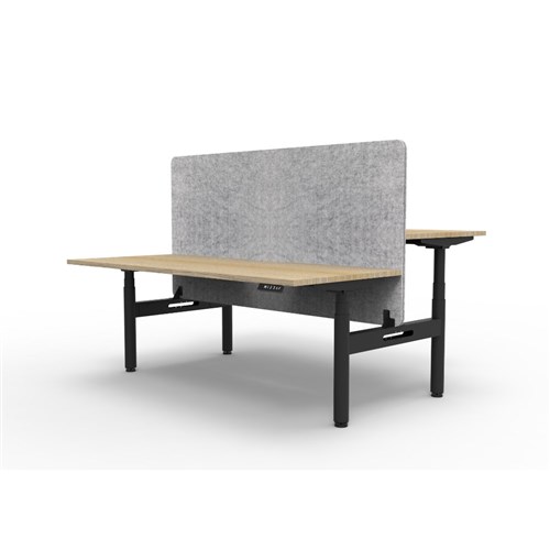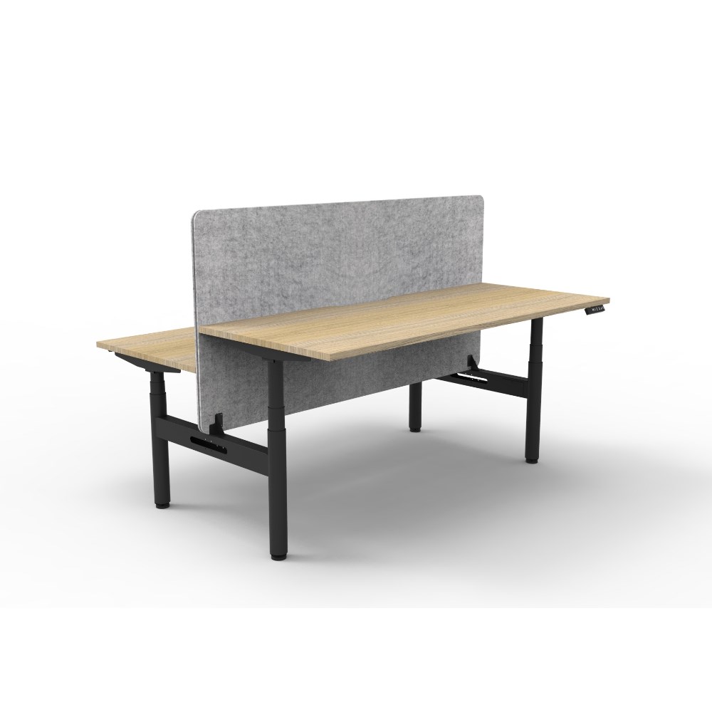 Electric height adjustable 2 person back to back workstation with Natural Oak top and Black Satin frame, Grey Eco screen.