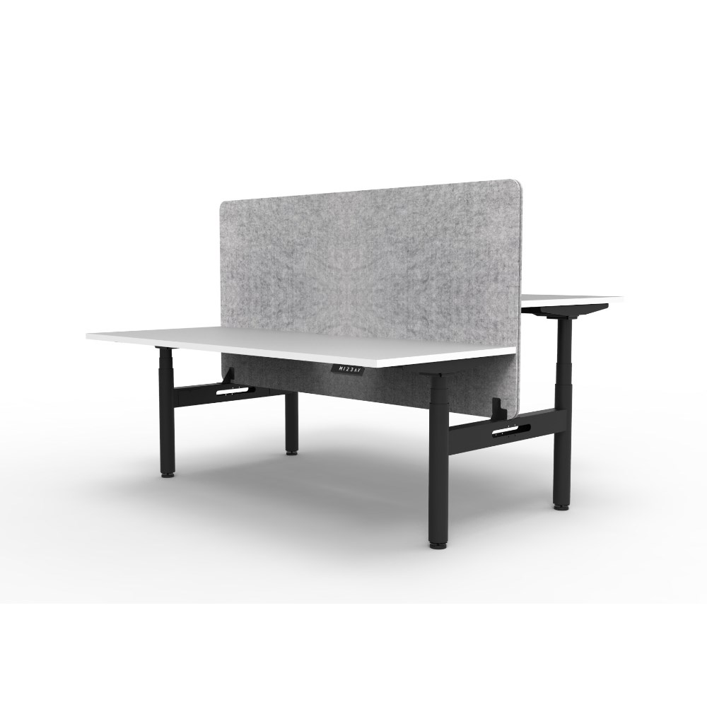 Electric height adjustable 2 person back to back workstation with White top and Black Satin frame, Grey Eco screen.