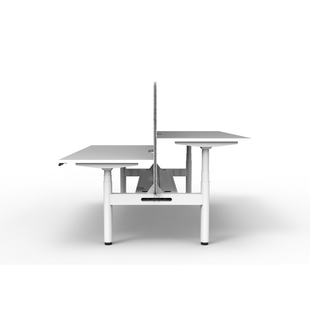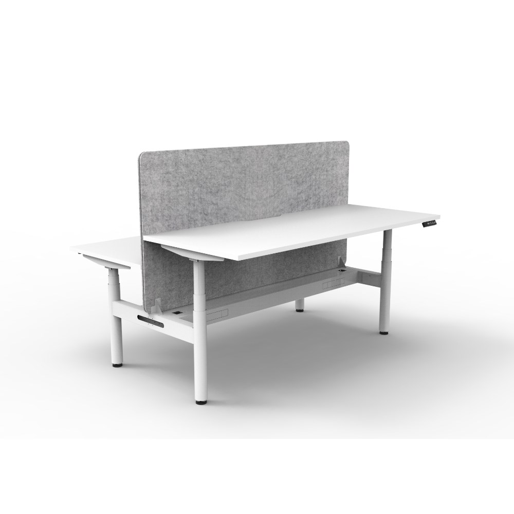 Electric height adjustable 2 person back to back workstation with White top and White Satin frame, Grey Eco screen and cable tray.