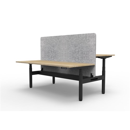 Electric height adjustable 2 person back to back workstation with Natural Oak top and Black Satin frame, Grey Eco screen and cable tray.