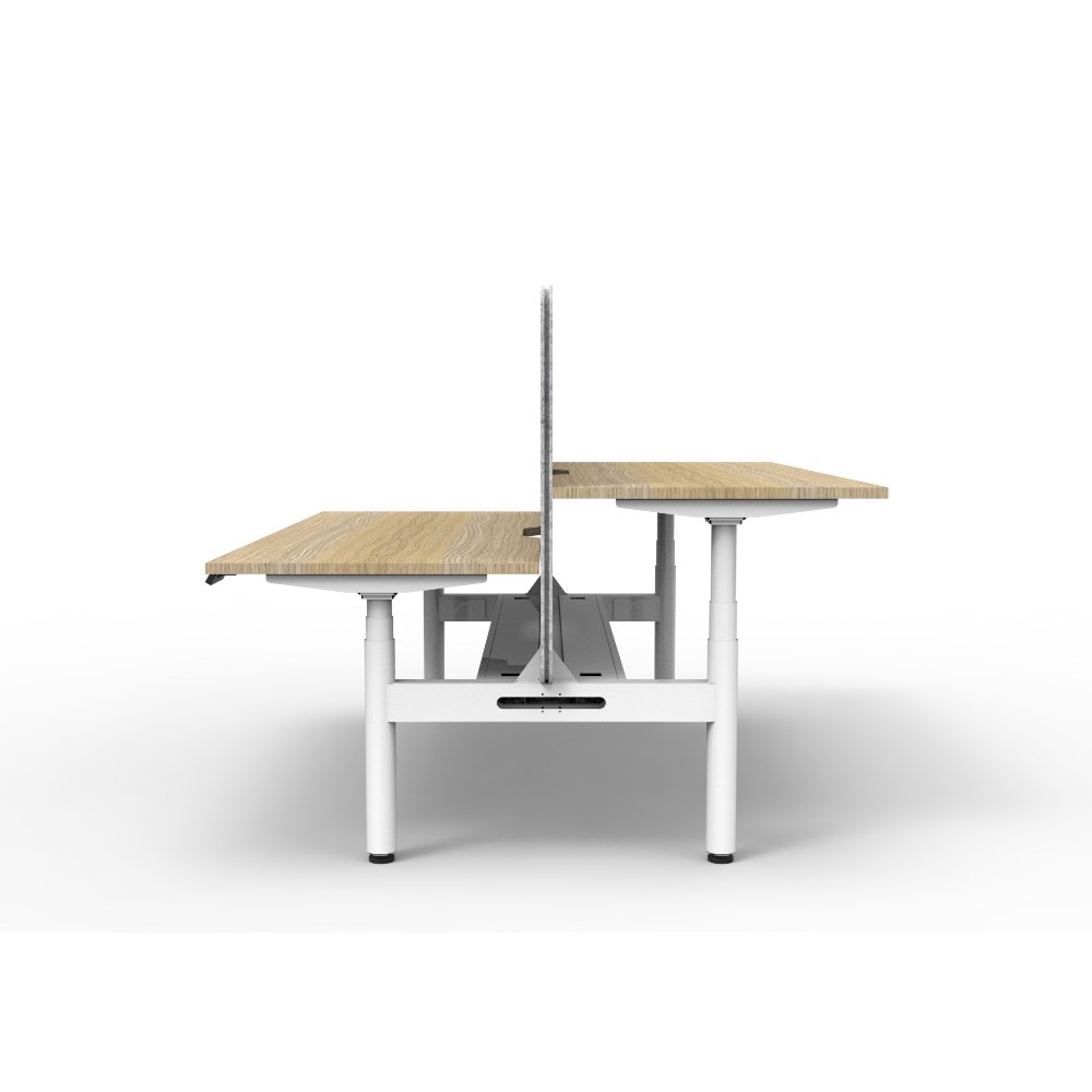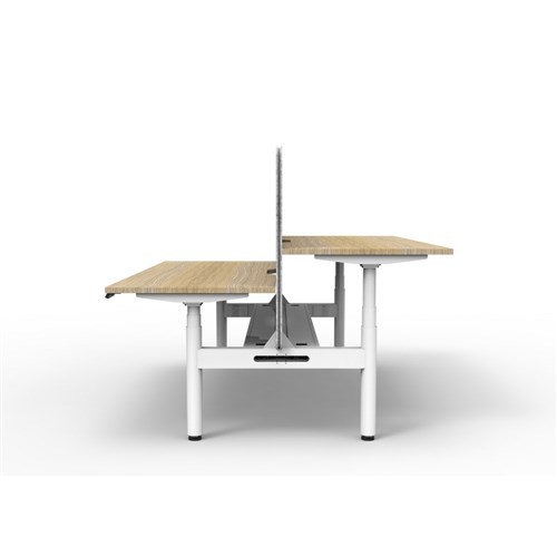 Electric height adjustable 2 person back to back workstation with Natural Oak top and White Satin frame, Grey Eco screen and cable tray.