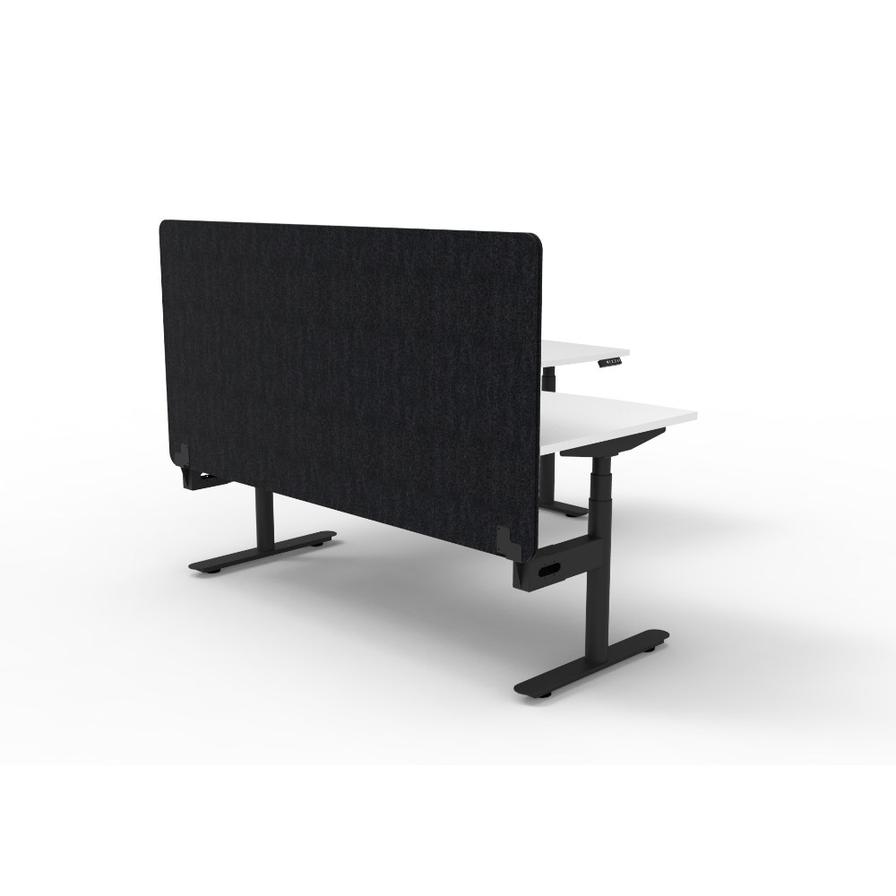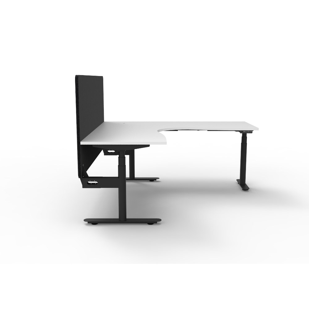 Electric height adjustable corner workstation with White top and Black Satin frame, Black Eco screen.