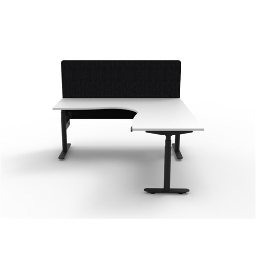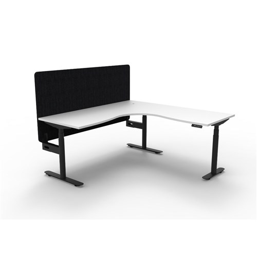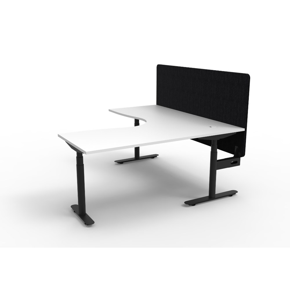 Electric height adjustable corner workstation with White top and Black Satin frame, Black Eco screen.