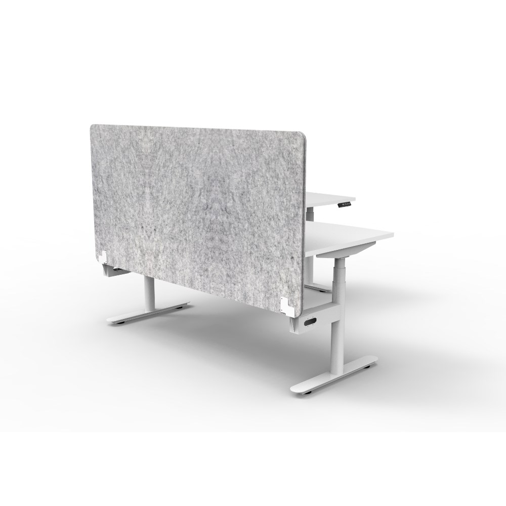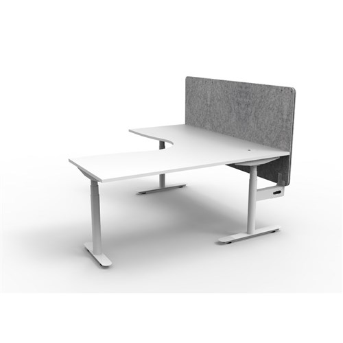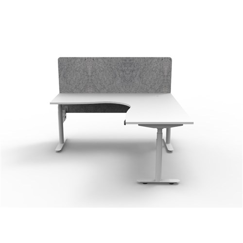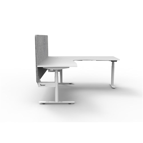 Electric height adjustable corner workstation with White top and White Satin frame, Grey Eco screen.