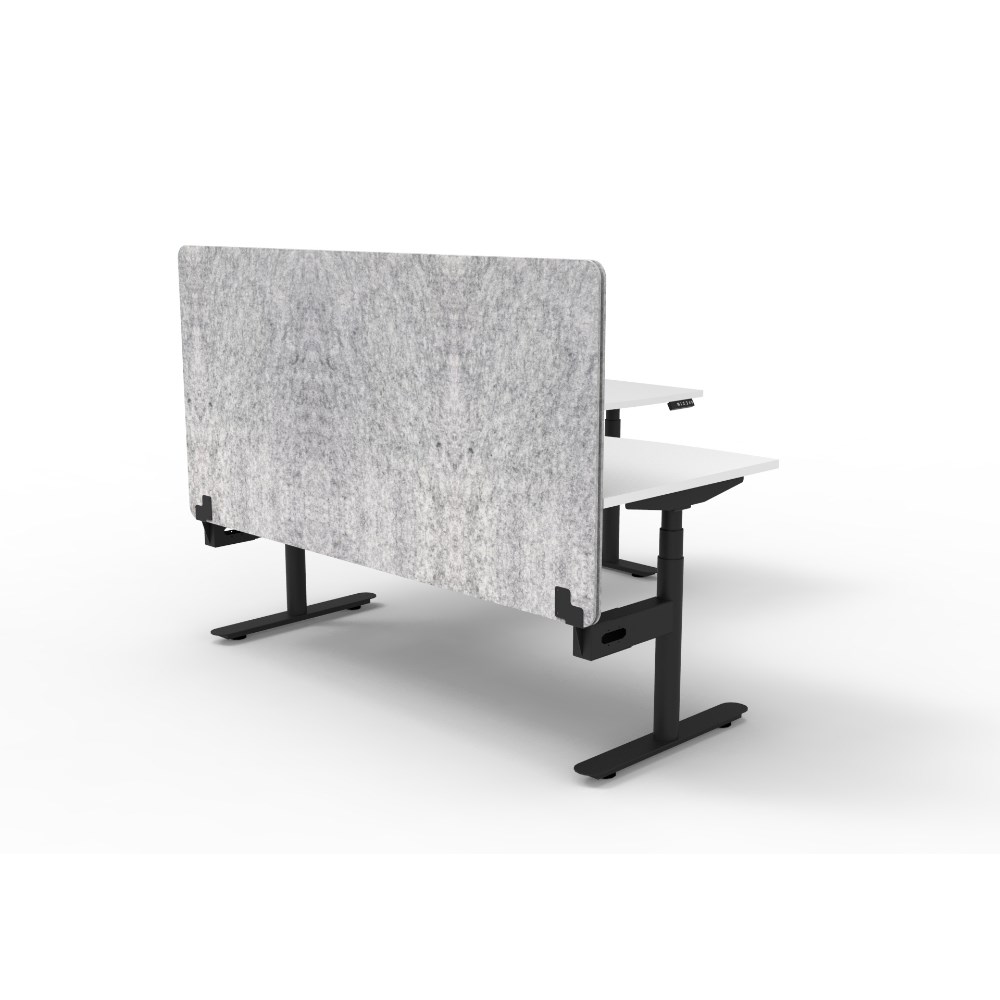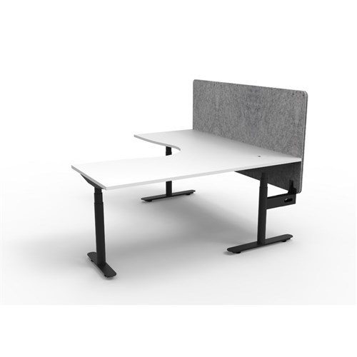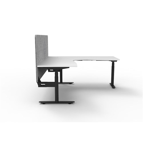 Electric height adjustable corner workstation with White top and Black Satin frame, Grey Eco screen.