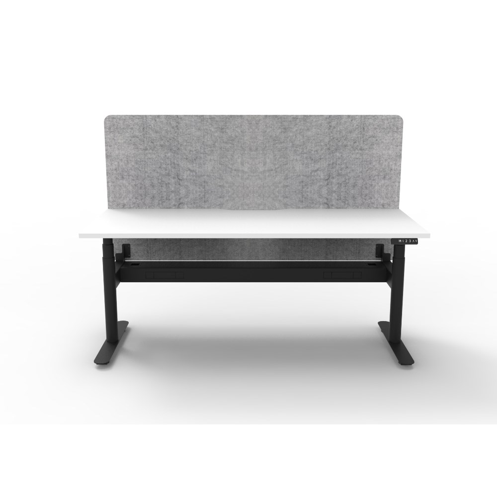 Natural White worksurface with rigid edging and 50mm scallop cable cut out. E0 rated 25mm top. Black Satin powder coat round-leg frame. Eco screen and cable tray.