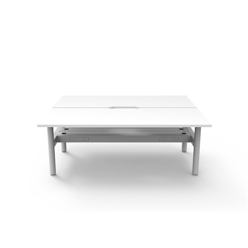 Natural White top White Satin frame. Double sided workstation with cable tray.