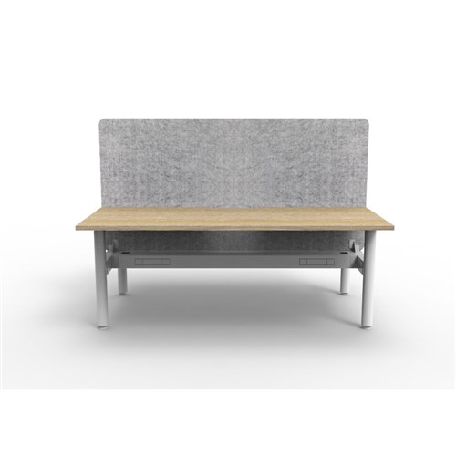 2 person back to back workstation with Natural Oak top and White Satin frame, Grey Eco screen and cable tray.