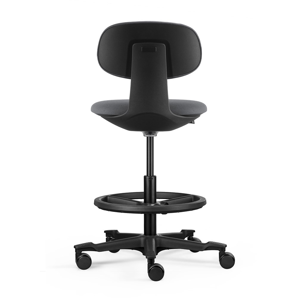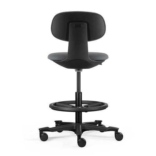 A height-adjustable sit-stand chair. The moulded foam seat and back and the nylon base with castors ensure user comfort and easy mobility.