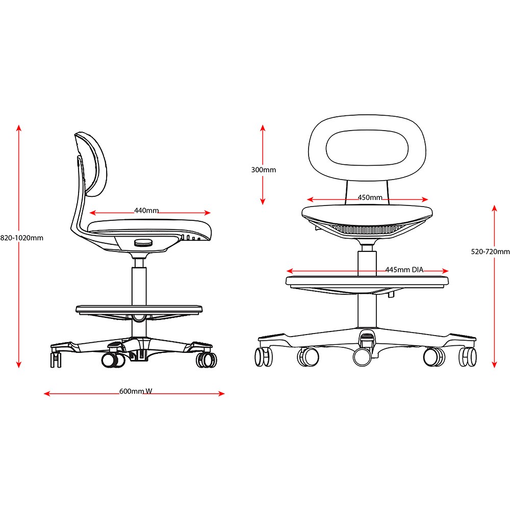 Chair Dimensions: Seat 450W x 440D x Seat 520-720mmH. Overall height: 820-1020mmH.