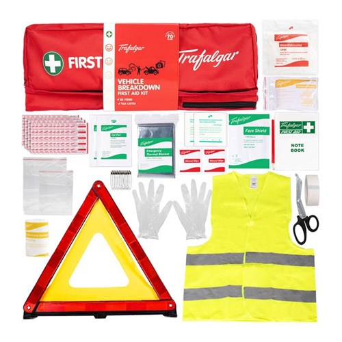 1 x Gloves Disposable Pair, 1 x Notepad and Pencil, 12 x Safety Pins Assorted, 1 x Safety Triangle, 1 x Safety Vest High Visibility (Yellow), 1 x Scissors, 1 x Tape Hypoallergenic 1.25cm x 9m.