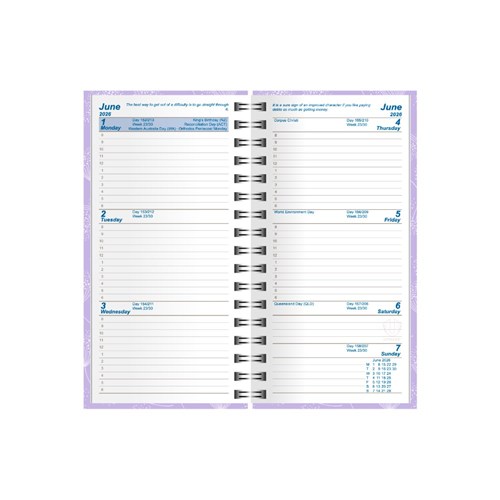 With a pocket size that makes it easy to carry around with you, this diary features a week to view layout and double wire binding so you can easily open and close it while on the go.